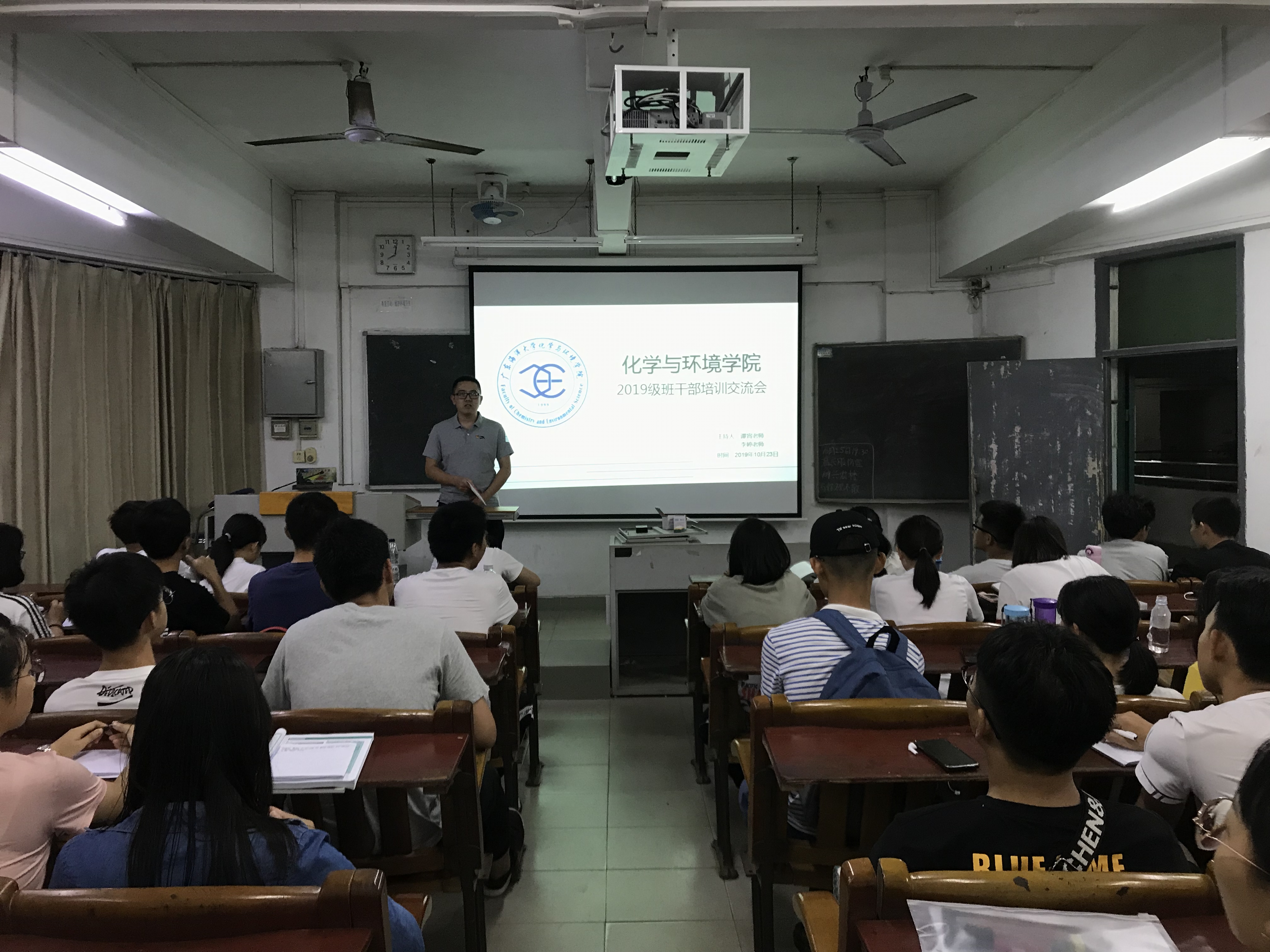 10月23日上午,化学与环境学院在第二教学楼B3401,举行2019级首届班干部培训班。学院副书记、辅导员老师、19级全体班干部和其它年级优秀班干部代表,近100人参加。柯伟作了《班干部应具有的能力素质与工作技巧》的报告,对大学班干部的特点进行了详细地解读,就如何开展工作、建设集体给出了指导意见。他对班干部的能力和素质提出了要求:一要学会自我管理,协调好学习与工作的关系。二要融入集体,建立良好的人际关系。三要分清工作的轻重缓急,提高工作效率。四要提高素质修养,能容人、能受挫、做有心人。