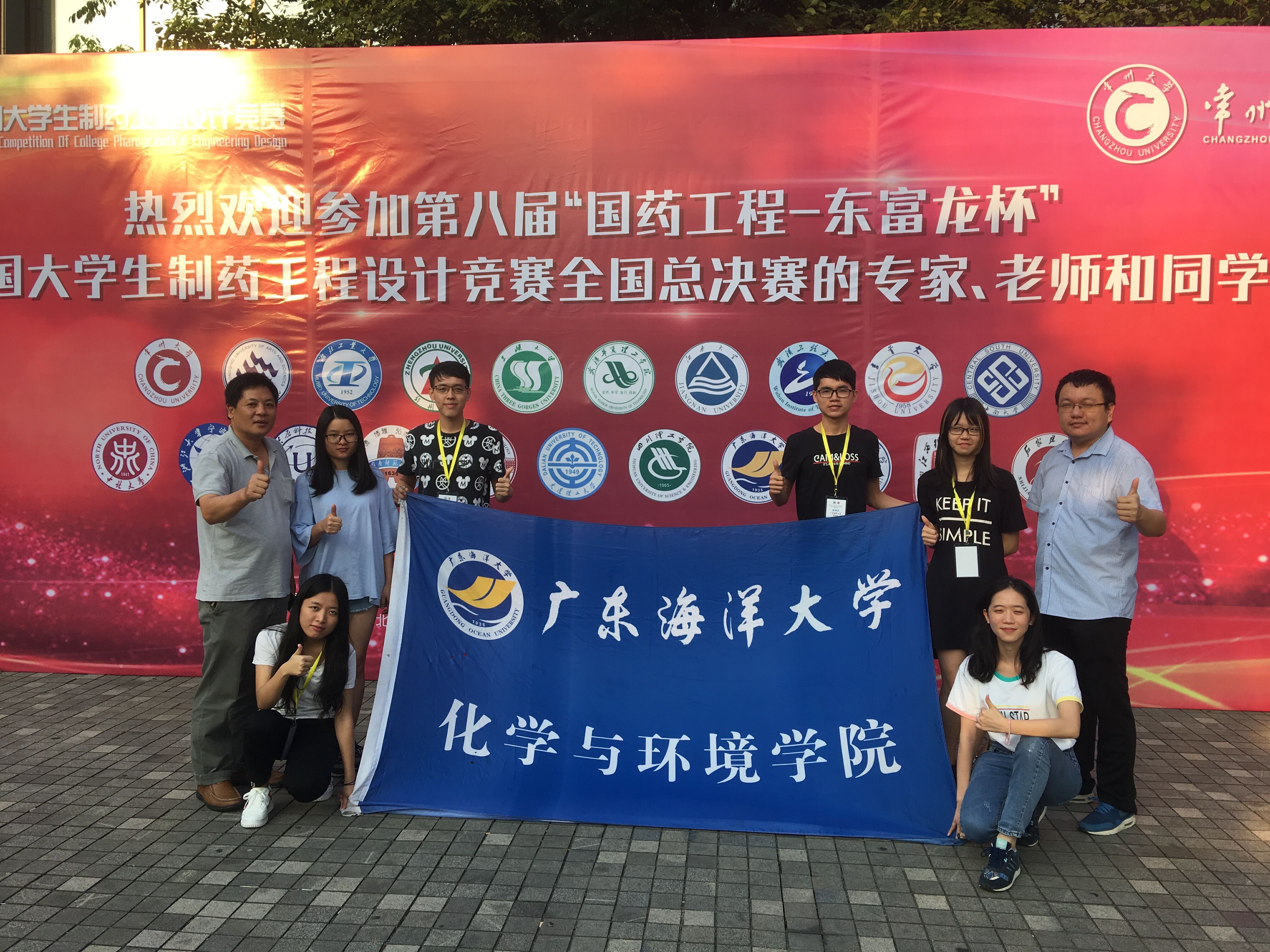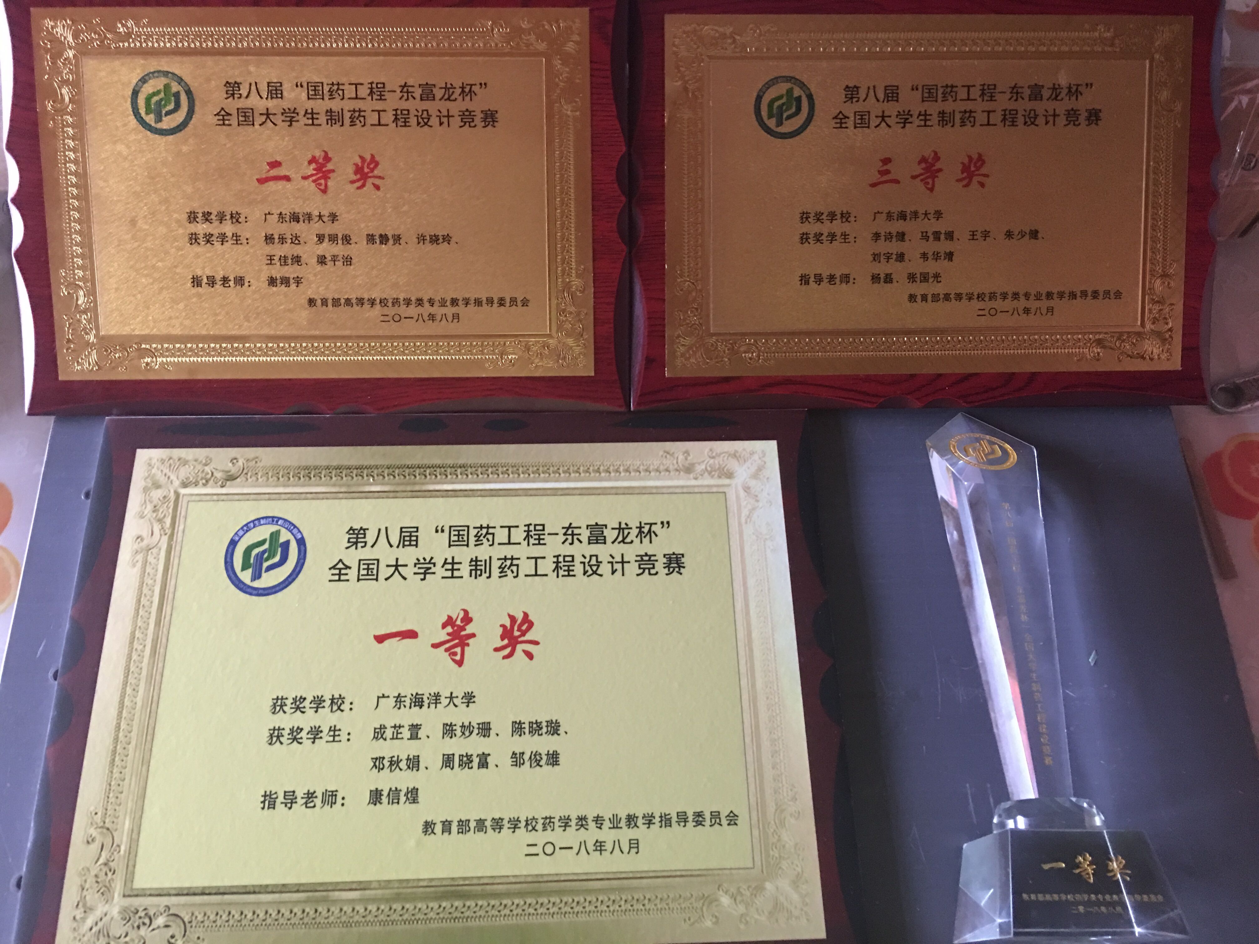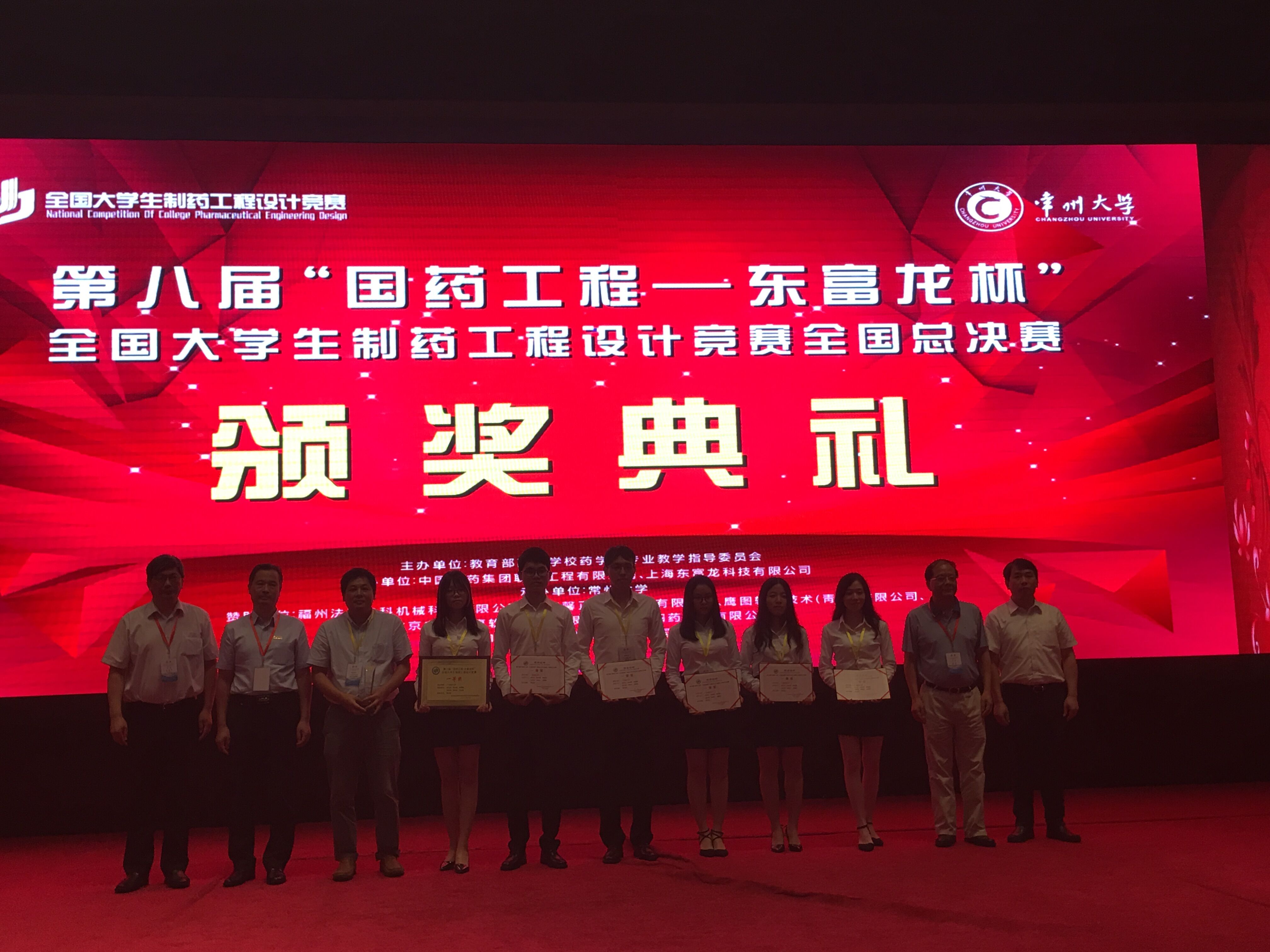 由教育部高等学校药学类专业教学指导委员会主办、中国医药集团联合工程有限公司与上海东富龙科技股份有限公司共同协办、常州大学承办的第八届“国药工程-东富龙杯”全国大学生制药工程设计竞赛在常州举行。我校三支参赛队伍分别荣获全国一等奖,二等奖,三等奖,再创佳绩,在整个广东省的所有参赛队伍中排第一名。