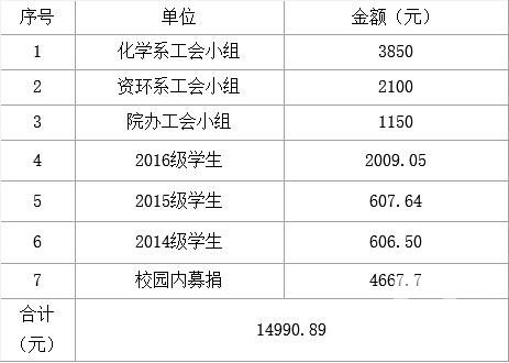 2017年5月21日,我院药剂1142班欧阳康平同学在广医附属医院确诊患了肝恶性肿瘤。5月22日,学院领导到广医附属医院看望欧阳康平同学,了解到欧阳康平因家庭贫困无力承担高额医疗费用。化学与环境学院工会于5月24日发出为欧阳康平同学捐款倡议书,积极组织师生开展捐助活动,在5月25-31日开展校园爱心募捐活动。病魔无情人有情,活动一经开展,老师和同学们都踊跃地参与了线上或线下捐款,献上自己的一份爱心。