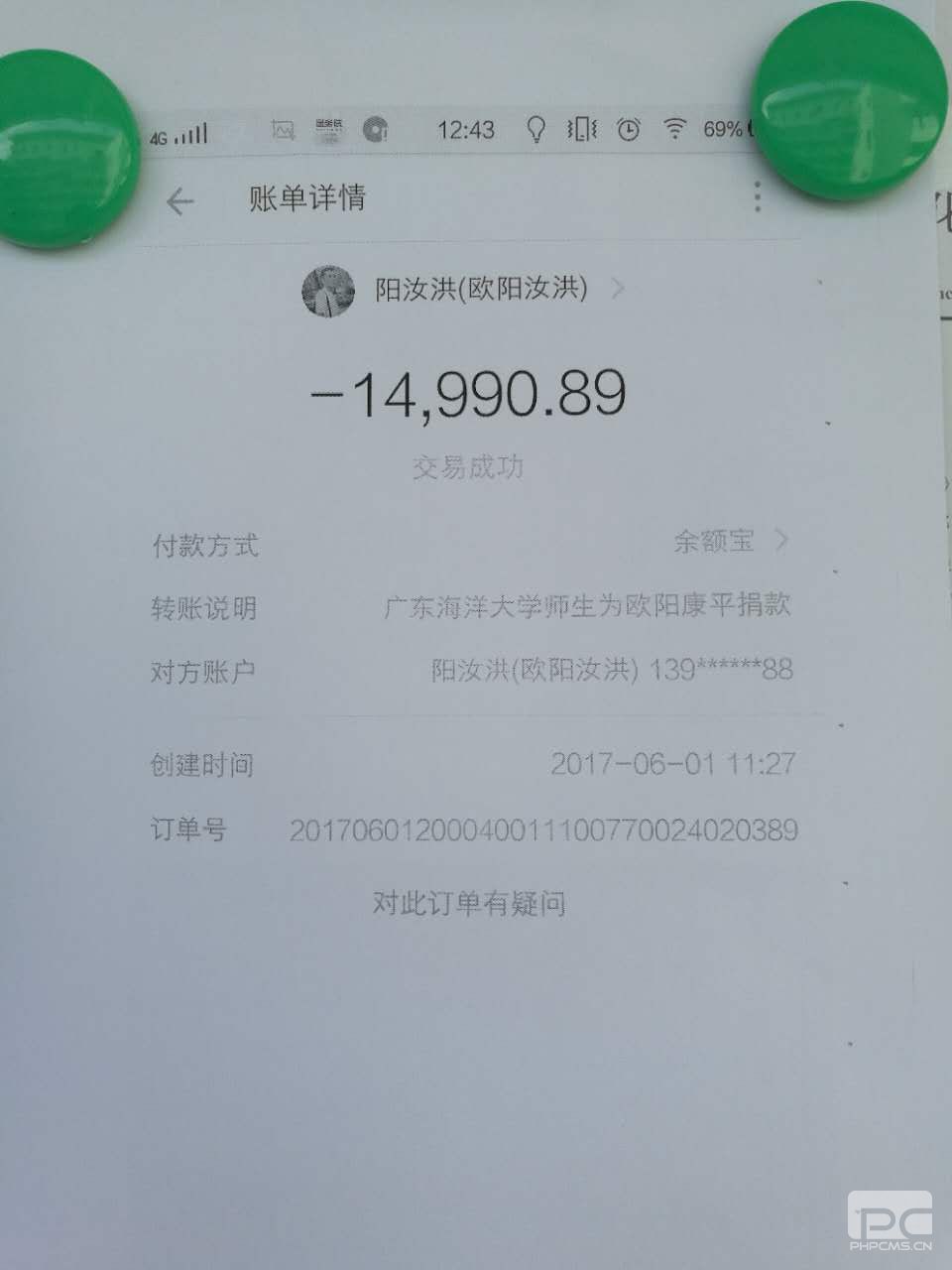 欧阳康平父亲欧阳汝洪的微信和支付宝