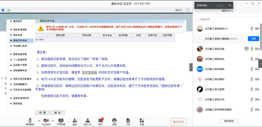 2020年5月24日晚,化学与环境学院在腾讯会议上召开了2020届贷款毕业生还款确认暨诚信教育会议。奖助贷专项负责老师罗少杰、化学与环境学院团委学生会勤工部各成员、2020届贷款学生共38人参加会议。此次会议由赵志敏主持。