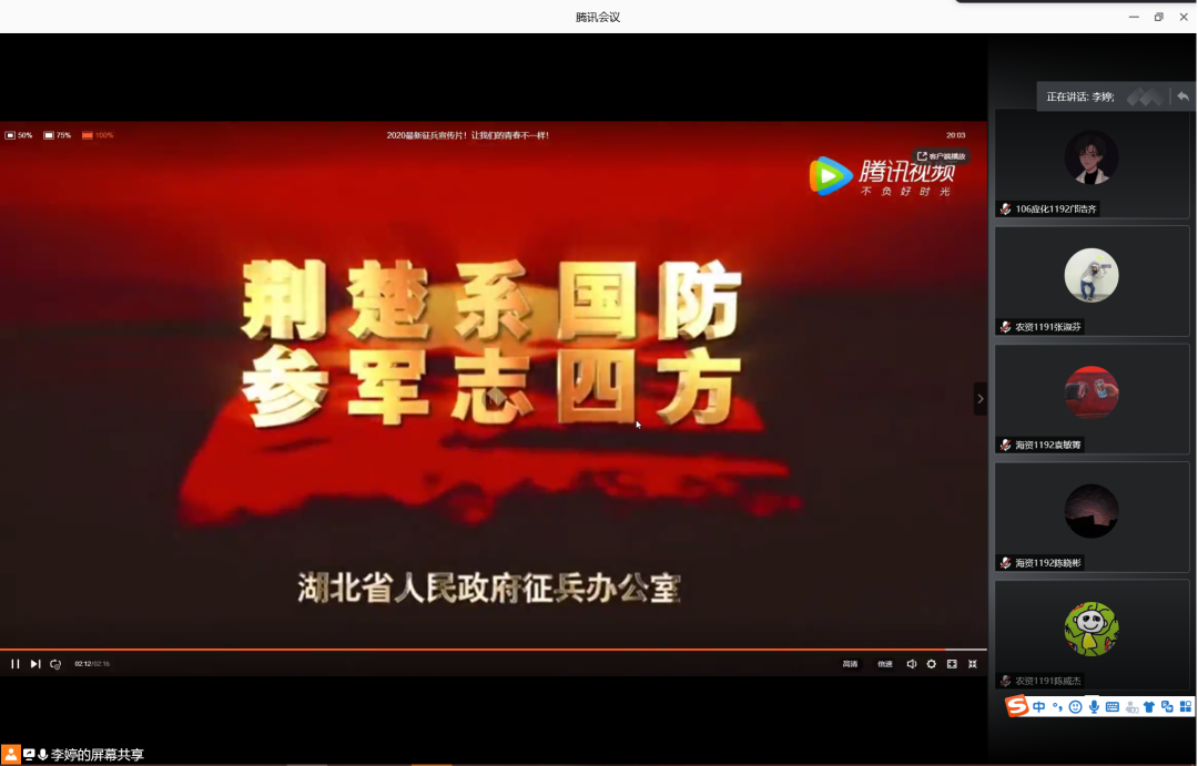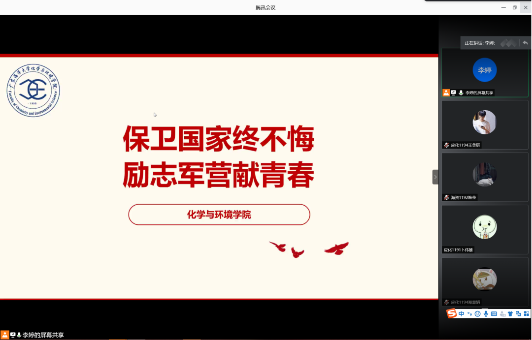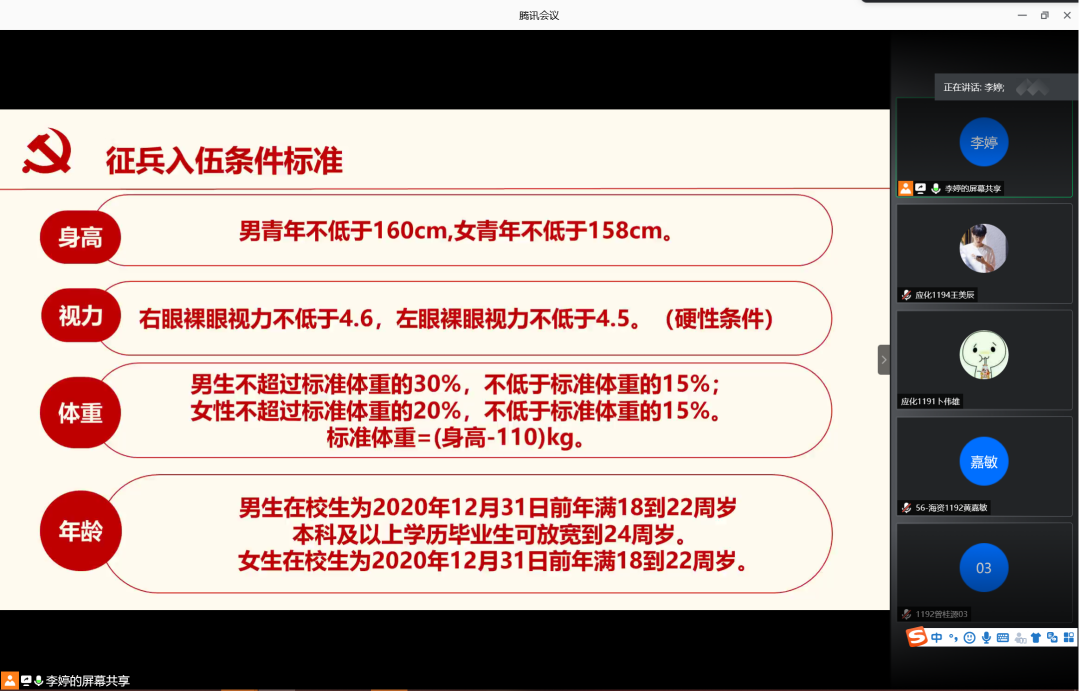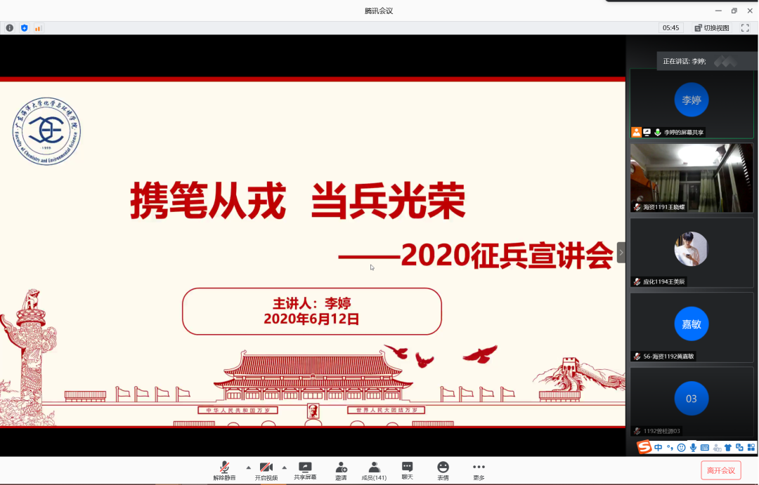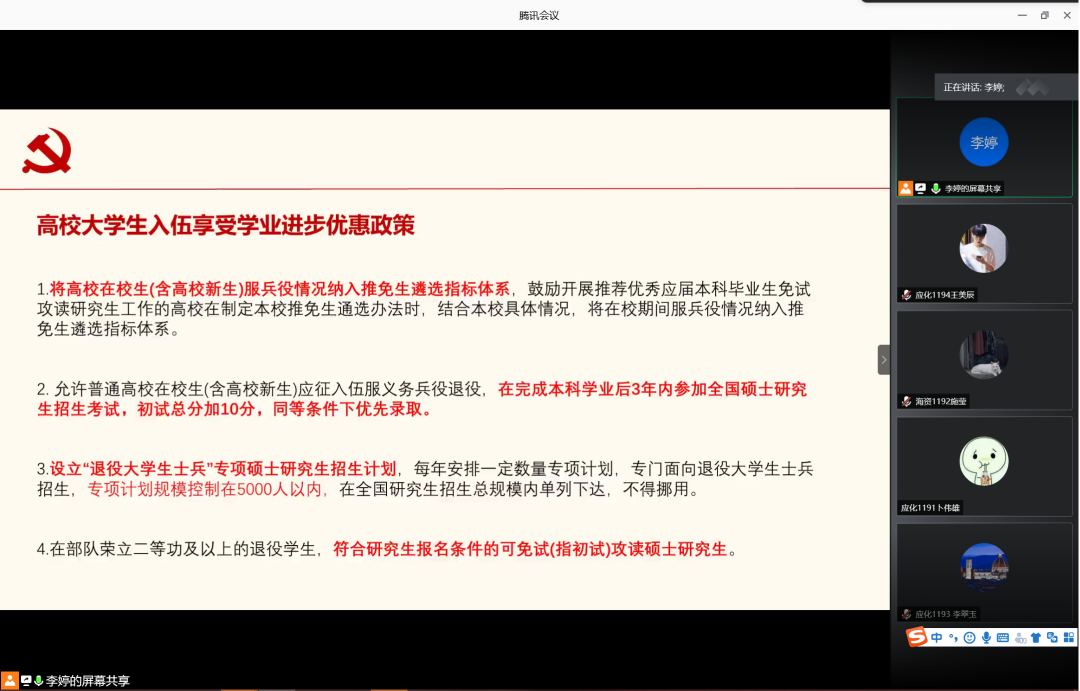 为增强学生入伍积极性,鼓励学生携笔从戎,积极入伍,6月12日晚,化学与环境学院在腾讯会议室召开2020年征兵宣讲会。会议由辅导员李婷主讲,化学与环境学院2019级学生共计160余人参加此次宣讲会。