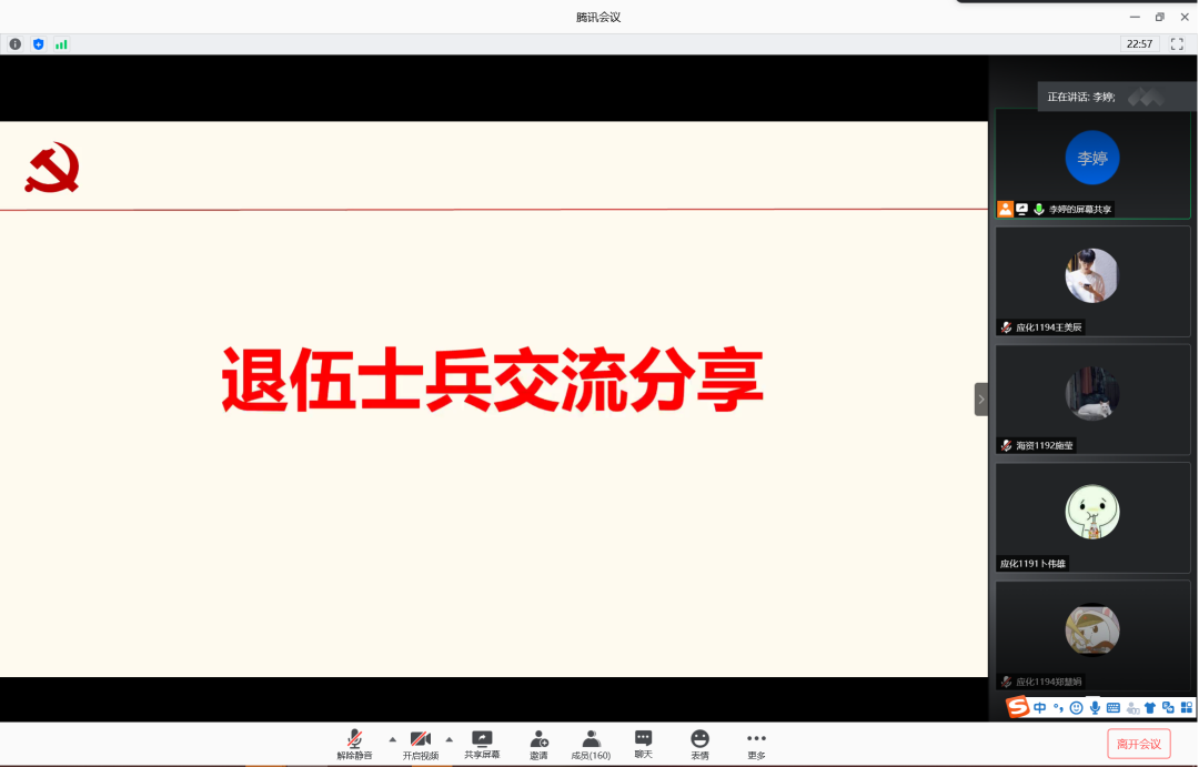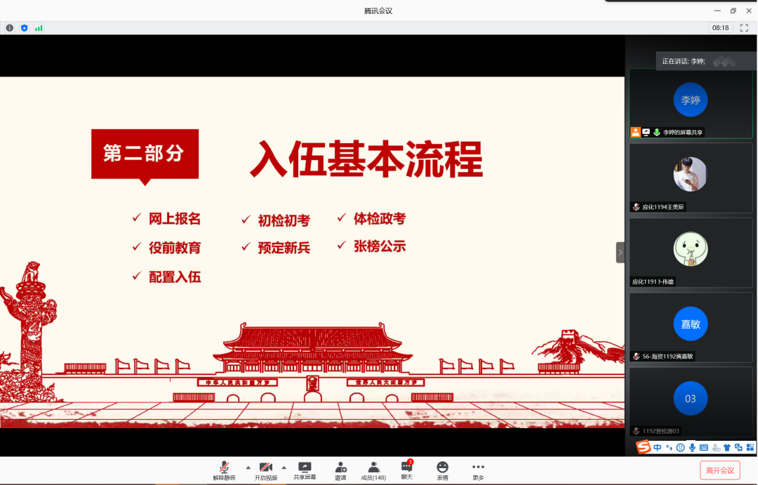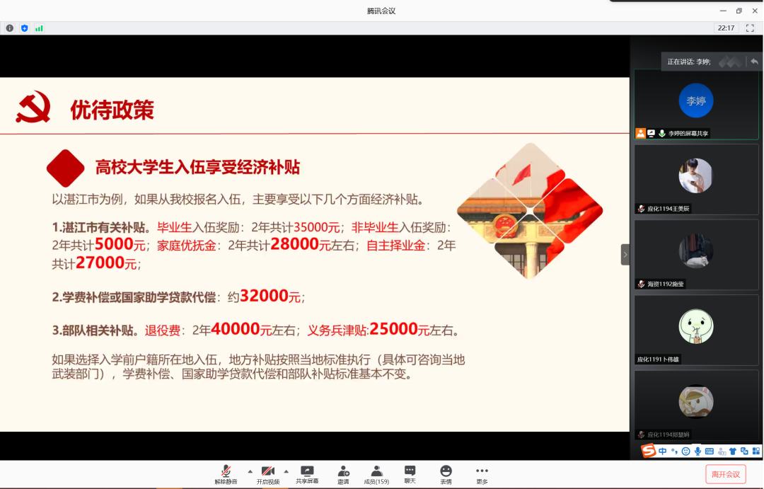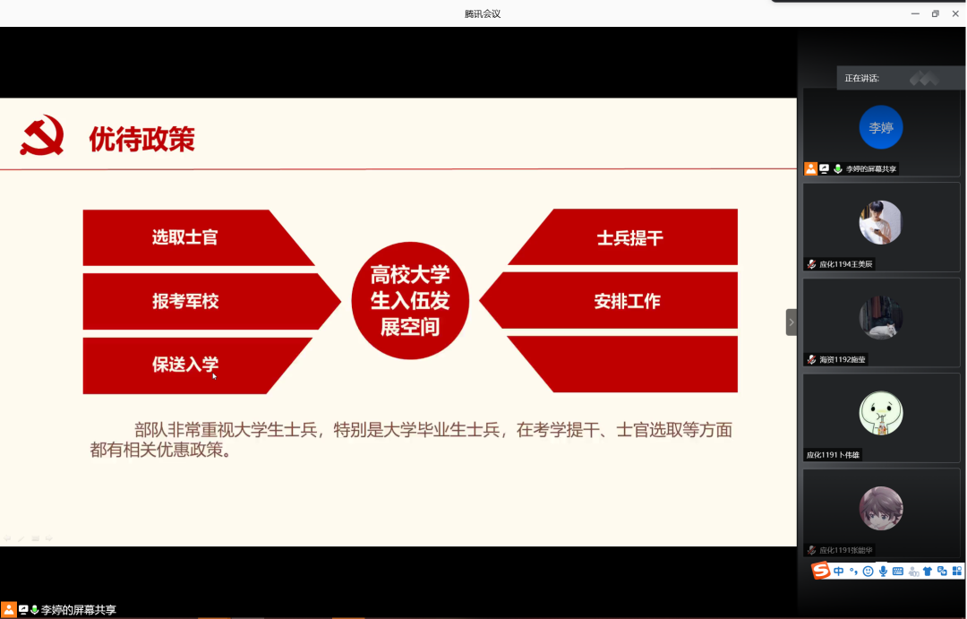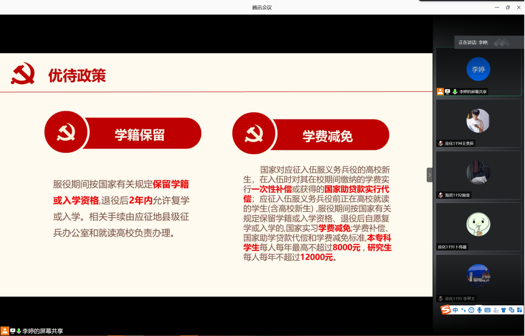 为增强学生入伍积极性,鼓励学生携笔从戎,积极入伍,6月12日晚,化学与环境学院在腾讯会议室召开2020年征兵宣讲会。会议由辅导员李婷主讲,化学与环境学院2019级学生共计160余人参加此次宣讲会。