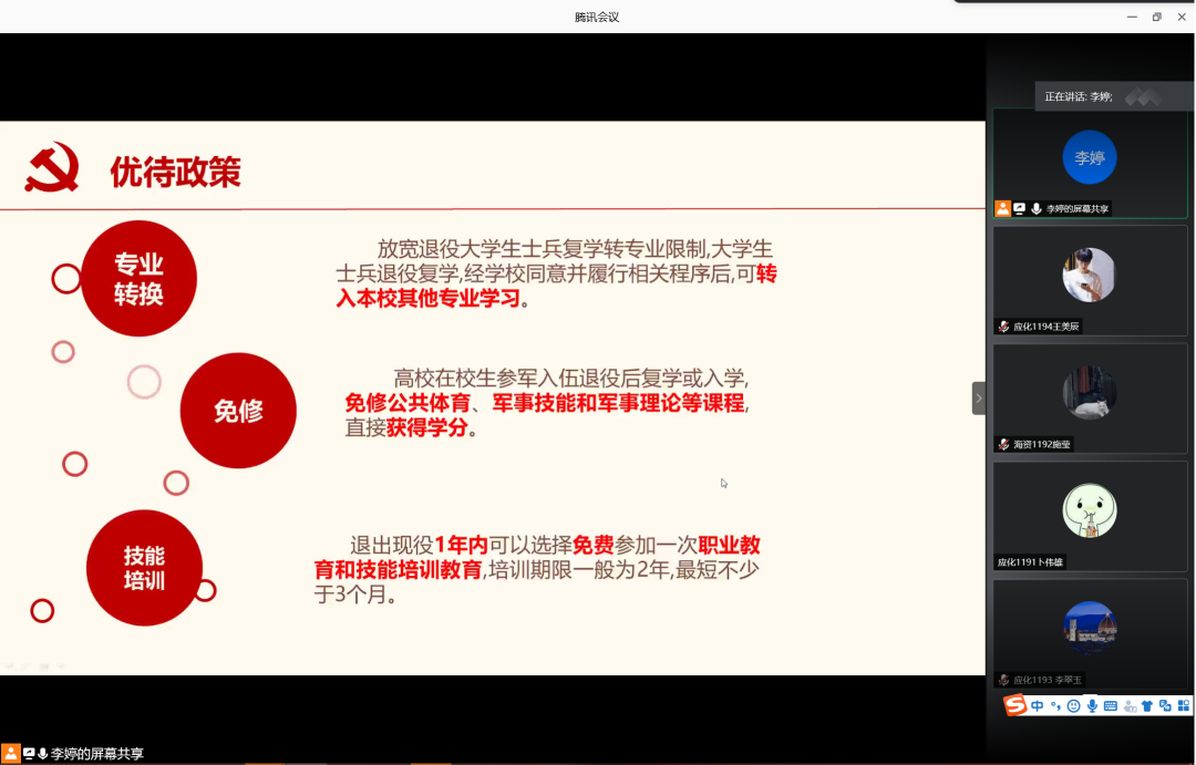 辅导员着重向我们分点介绍入伍优待政策,给我们总结入伍有何社会、经济上的优待福利,对自身发展有何益处,鼓励学生积极入伍。演示文稿内也清晰详细地说明了入伍优待政策。