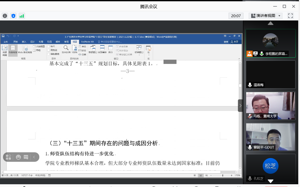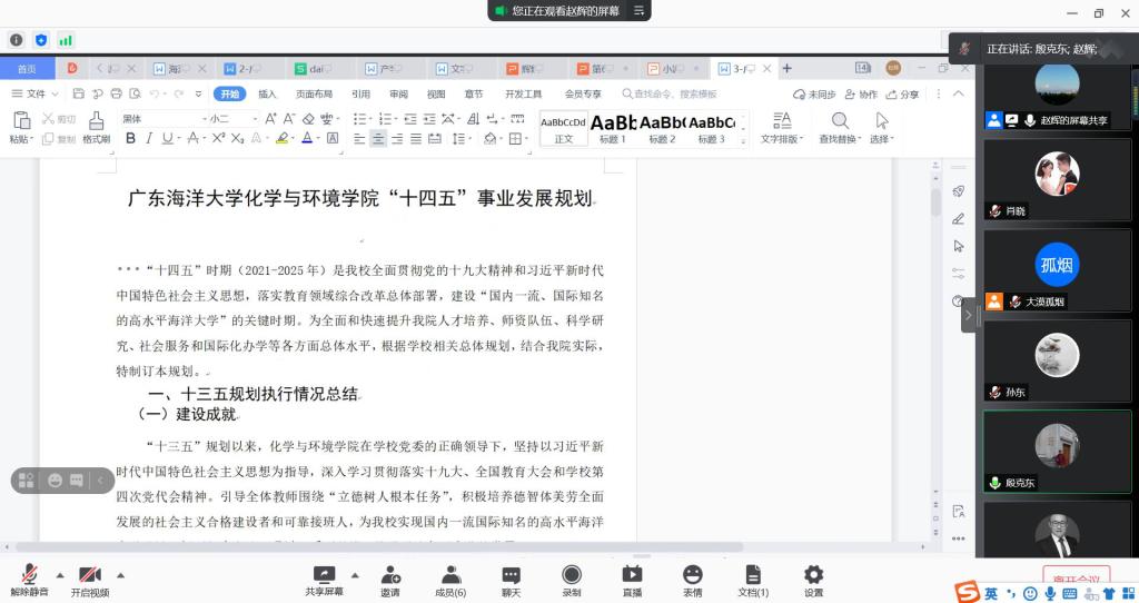 2021年6月19日-20日,根据学院“十四五”规划方案编制的需要,化学与环境学院在腾讯会议上召开“十四五”规划专家论证会,会议邀请了来自中山大学的殷克东教授、英国诺丁汉特伦特大学的潘刚教授、广东工业大学霍延平教授和暨南大学马栋教授。会议由赵辉副院长(主持学院行政全面工作)主持,资环系和应化系负责人及相关专业骨干教师参加了此次论证会。
