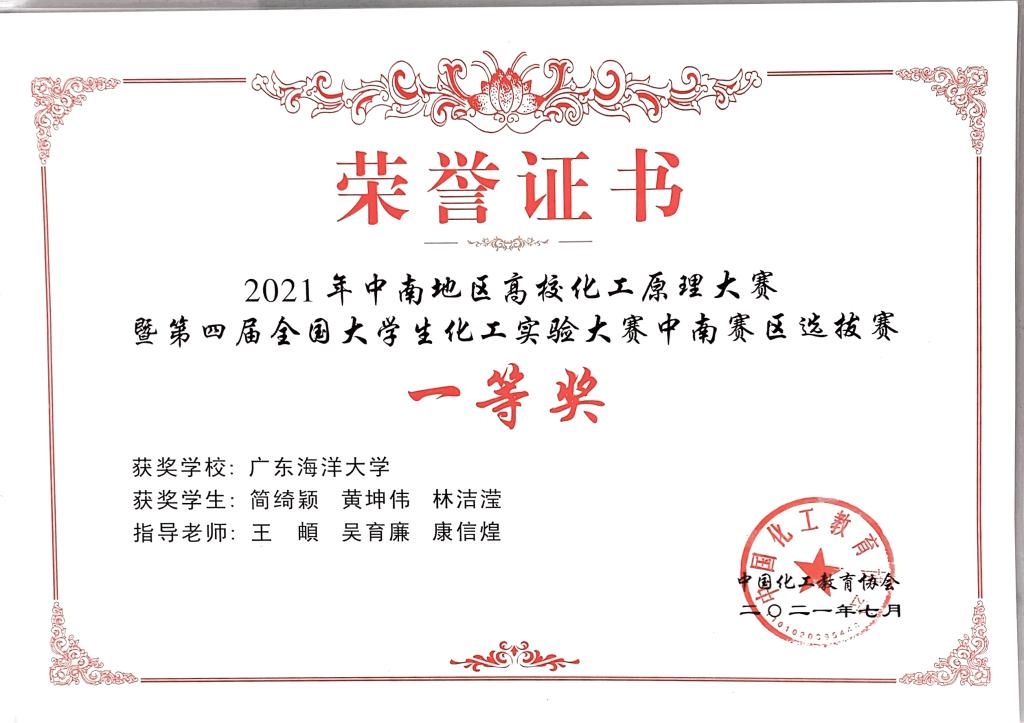此次大赛得到了学院的大力支持,通过院内选拔,2019级应化专业学生简绮颖、黄坤伟、林洁滢脱颖而出。通过两个月的集中指导和准备,在指导老师王頔、吴育廉、康信煌的共同努力下,经过两天激烈地角逐,我院参赛队伍获得了中南赛区一等奖,进入全国总决赛(九月在南京工业大学举办)。此次大赛展示了我院学生扎实的专业理论基础,较强的工程实践综合能力,体现了学院服务石油、化工及相关行业发展的教育理念。