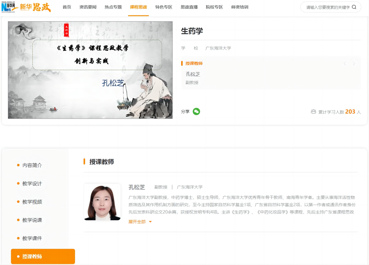 近日,由化学与环境学院孔松芝老师主讲的《生药学》课程的课程思政教学案例在新华网“新华思政”教学资源服务平台展播(请见“新华思政”教学资源链接)向全社会开放共享,形成了良好的示范效应。