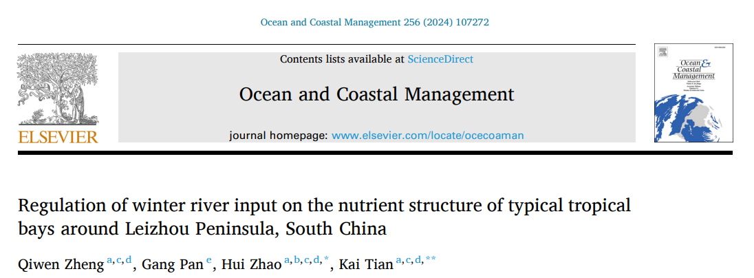 近日,william威廉中文官网化学与环境学院赵辉教授团队在爱思唯尔旗下国际海洋领域的著名学术期刊Ocean & Coastal Management (OCMA)上发表了题为“Regulation of winter river input on the nutrient structure of typical tropical bays around Leizhou Peninsula, South China”的研究论文(DOI: https://doi.org/10.1016/j.ocecoaman.2024.107272)。该研究利用陆海系统观测技术方法,估算了雷州半岛主要入海河流输入营养盐通量,探明了河流输入过程中典型热带海湾的营养盐结构及迁移转化过程,并运用河口-海湾双端元混合模型,分析了水体输运过程中营养盐发生的迁入迁出过程。结果表明:雷州半岛主要海湾冬季受河流影响较大,河流输入营养盐通量较高的海湾往往呈现出较高的营养盐浓度,河流输入是海湾营养盐的重要来源;营养盐通过河流向海湾输入迁移的过程中同时受物理过程和生物地球化学过程的双重调控,随着水体从近岸向离岸迁移,水体DIN/DIP由磷限制型转变为氮限制型;分析发现,雷州湾和鉴江湾受河流输入和沿岸活动的影响较大,存在富营养化的潜在风险,湛江湾的富营养化风险受到水动力条件和浑浊度的影响,安铺湾同时受到河流和其它输入源的影响,但自净能力较强。本研究可为雷州半岛水污染控制和水环境管理提供科学支撑,为海湾污染防控提供参考。
