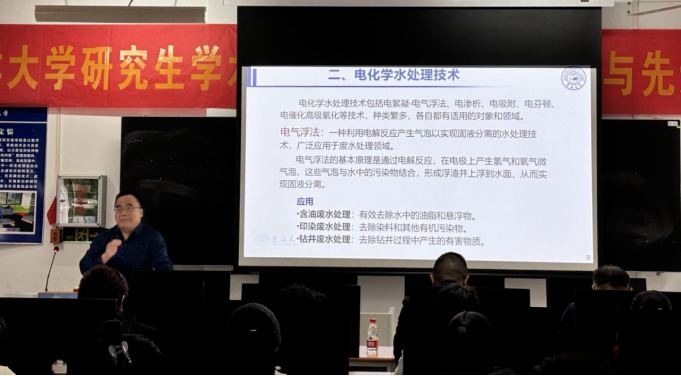 在主题报告环节,吉林大学李克昌副教授以《电化学水处理技术的发展与应用》为题,系统展示了电化学水处理技术的发展历程、优势与联合应用实践。我院张鹏副教授的报告《台风对河口-近海水质动态调节过程与藻华形成机制:高频观测到AI预测》通过严谨的模型构建和实验分析,剖析了台风驱动热带海岸生态系统的级联效应。我院余传明副教授的报告《聚苯乙烯基超疏水多孔材料的构筑及油水分离应用》基于油水分离的现实需求,系统阐述了聚苯乙烯基多孔材料构筑与孔结构调控的物理/化学方法。